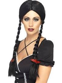 Gothic Schoolgirl Wig, Black, With Red Batwings