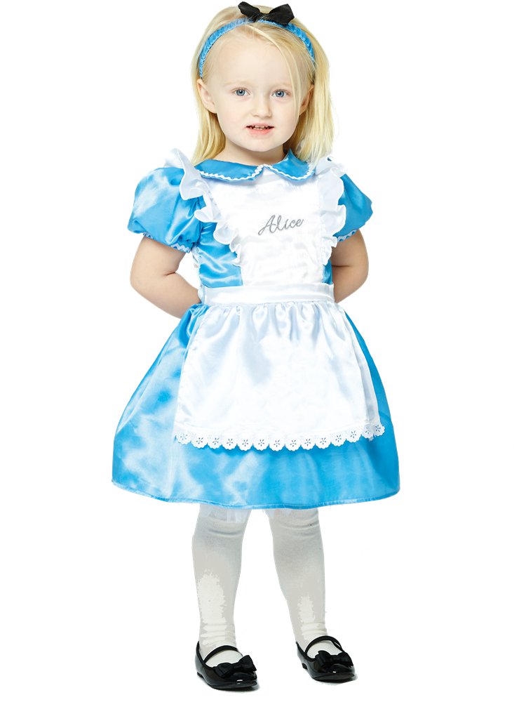 This cute, three piece, Disney licensed Alice costume includes a blue satin dress with an attached white apron and the name 'Alice' embroidered to front as well as a pair of white satin bloomers and a headband with black bow.