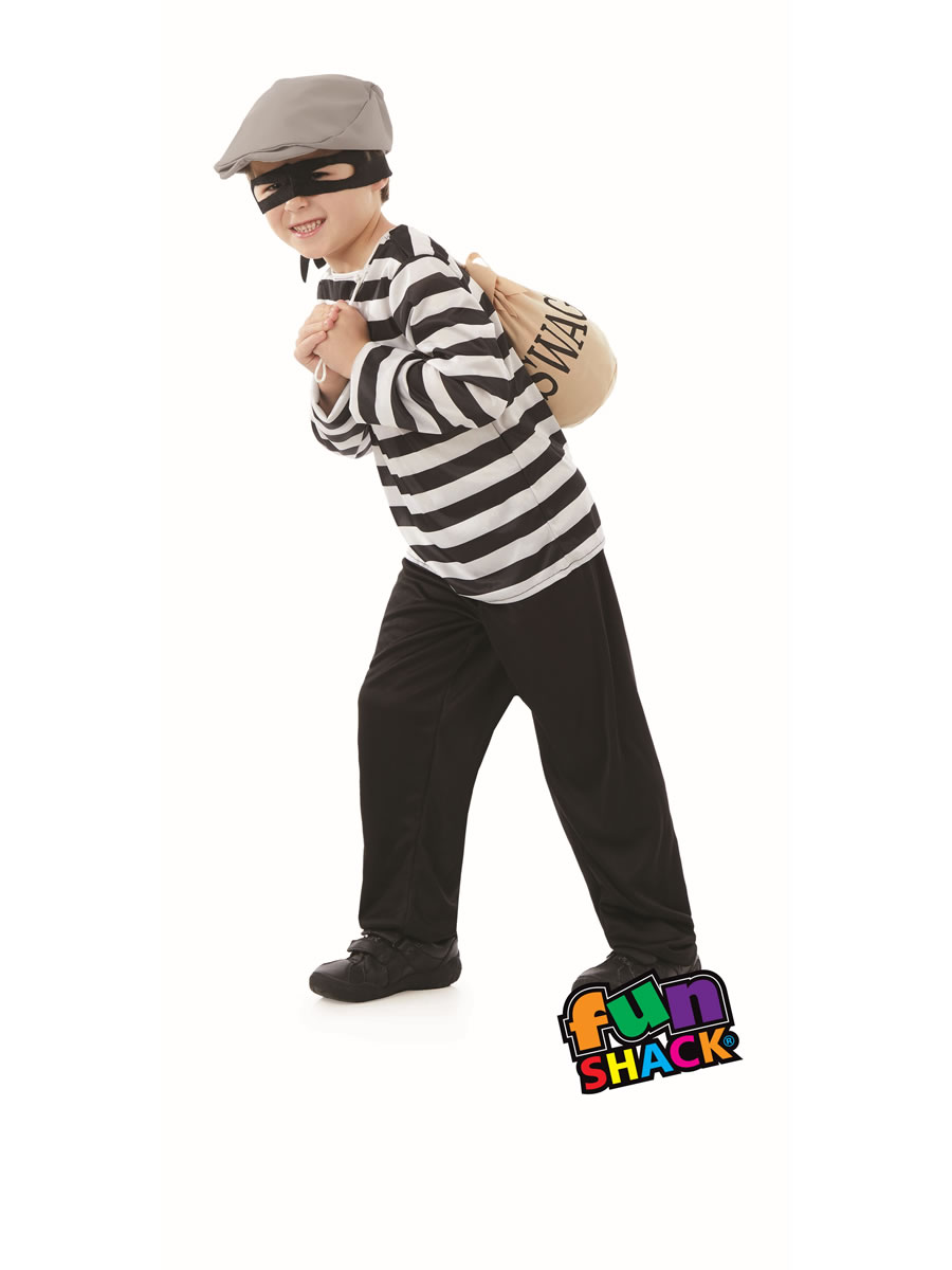 Our costume includes this classic black and white striped long sleeves top with a pair of black trousers. To accessorise is a grey flat cap, black eye mask and the brown swag bag.