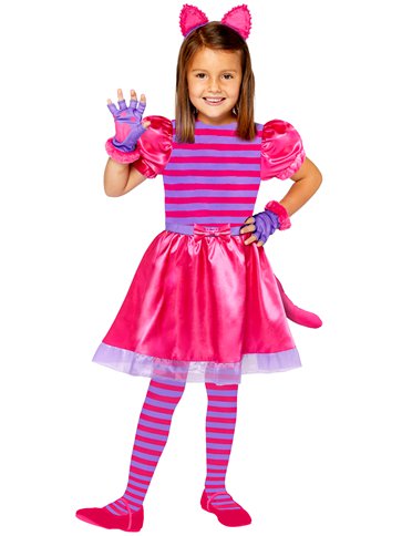 This Cheshire Cat costume includes a dress with a stripey bodice, multi- layered skirt and a fluffy tail which attaches with velcro to the back.