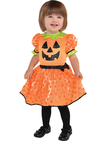 Dress your little pumpkin in this adorable orange dress with green and black trim for a Halloween treat! The cute costume features short puff sleeves, a full skirt and a green collar that looks like pumpkin leaves.