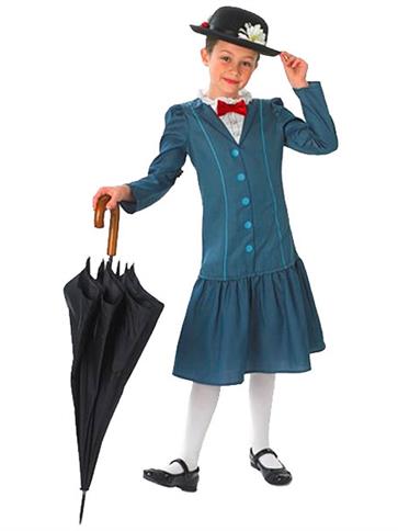 This delightful, two piece costume consists of a pale blue dress with a drop waist, printed jacket and shirt detail with red ,velvet bow-tie accent to front along with stretch fabric and velcro fastening to back, in addition also included is a black, sturdy bowler hat decorated with pretty daisy flowers and bright red berries