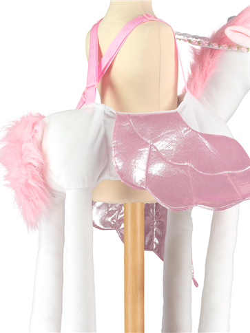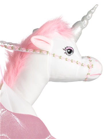The plush head has a pretty face with a golden horn and features a floral ribbon rein for the child to hold as they gallop around. This fairy tale creature makes a great addition to any dress up box.