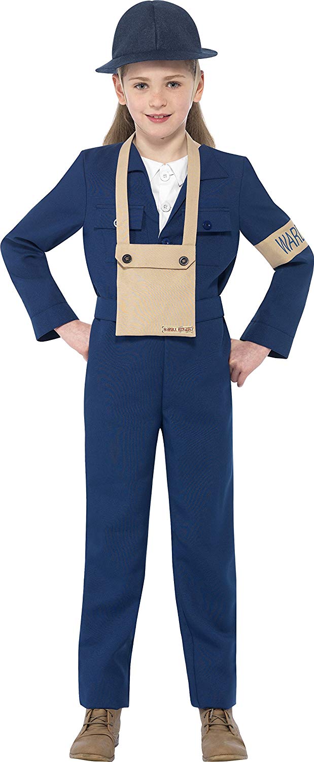 Children's Air Raid Warden Costume for Girls, Including: Jumpsuit, Hat and Bag, Blue jumpsuit with mock white shirt, Warden badge on sleeve, Beige bag with buttons to fasten close, Blue hat with chin strap completes the look,
