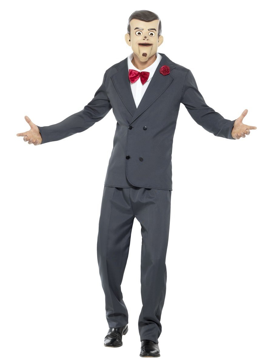 Goosebumps Slappy the Dummy Costume, Grey, with Jacket, Trousers, Mask, Mock Shirt & Bow Tie This officially licensed Goosebumps Slappy the Dummy Costume is perfect for Halloween parties. This costume comes with a grey jacket, trousers, mock shirt, bow tie and mask, simply add shoes to complete the look!