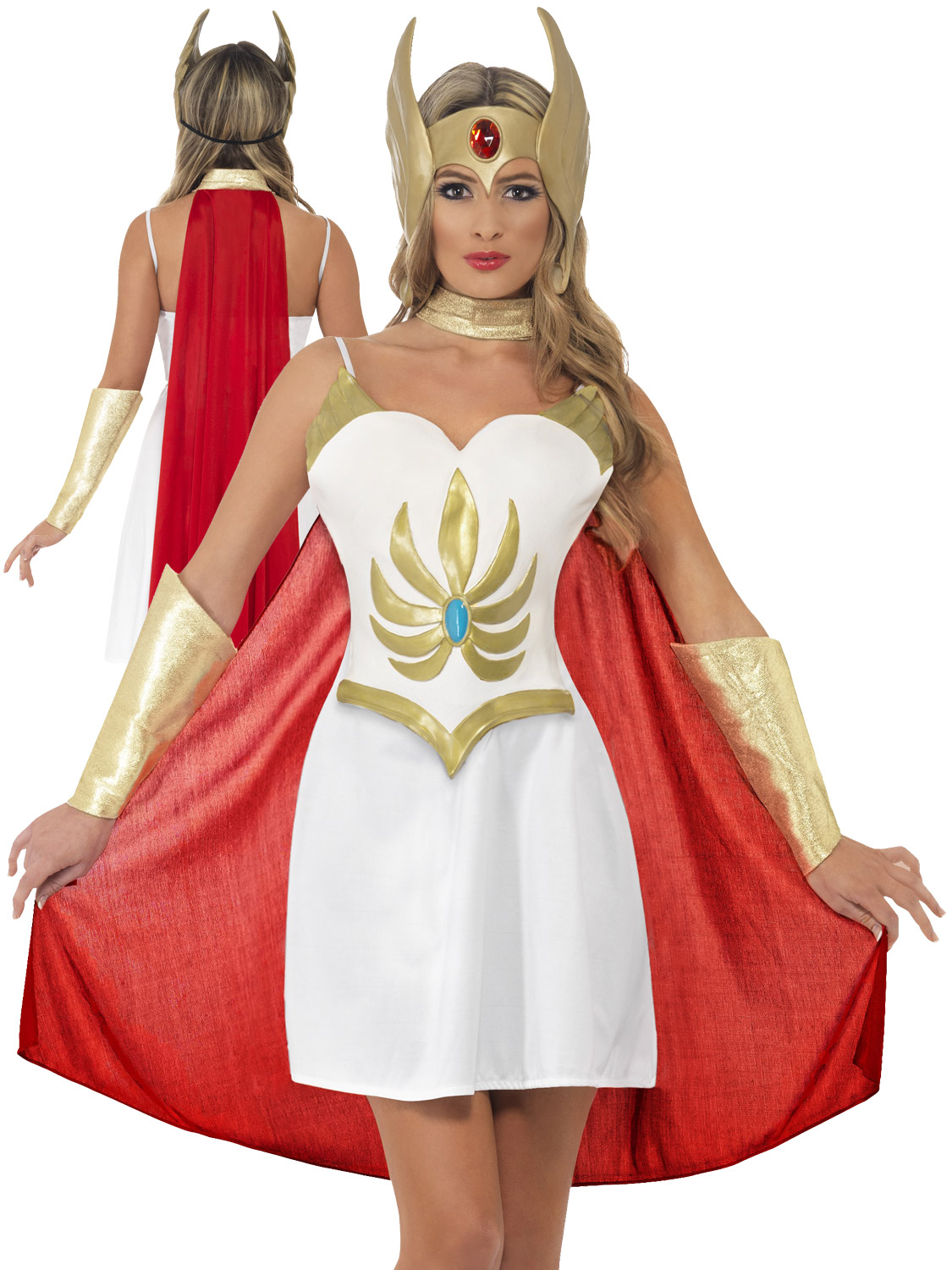 A Deluxe She-Ra Costume includes Dress, Latex Chest Piece, Arm Cuffs, Latex Crown and Cape, ideal for 1980s fancy dress!