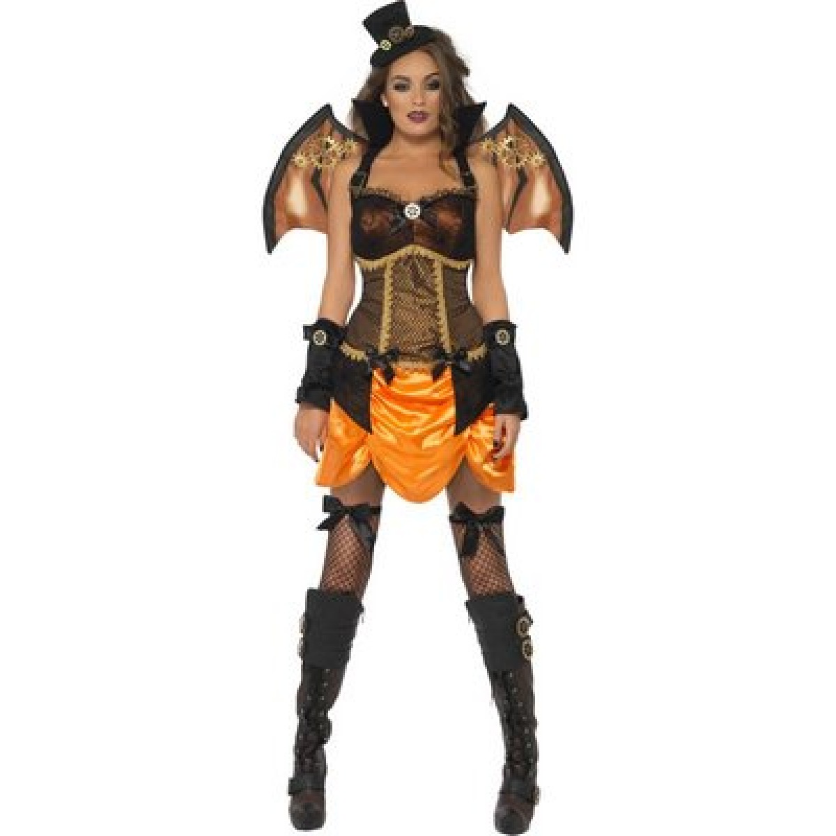 Check out this fantastic Steam Punk Victorian Sexy Bat Costume. It comes with a black and gold top with a black collar, a gold skirt, gold bat wings with cool and quirky cog details and a hat with a cog band. Steampunk is a combination of the aesthetic of the Victorian era (steam powered machines, brass instruments, clockwork, etc.) and the futuristic elements of science fiction. Many of the visual elements of steampunk have their origins in classic literature such as 20,000 Leagues Under the Sea by Jules Verne.