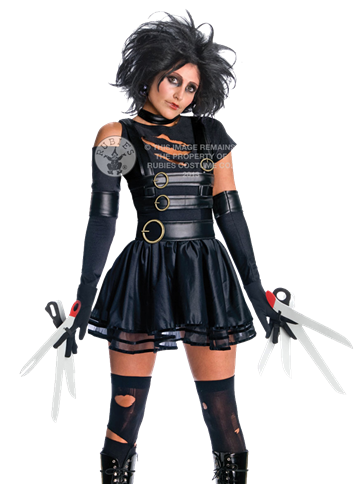 This Sexy Miss Scissorhands Costume features a short black dress with gold coloured buckles to the front, a pair of black scissor gloves, glovelet, black choker and belt.