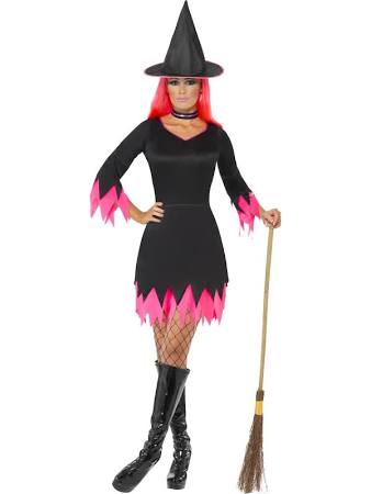 Perfect for Halloween, this Witch fancy dress costume includes black dress with jagged hem and pink layer underneath, black witch hat with pink trim and matching black choker. Just add black diamond net tights and a broom to complete the look!
