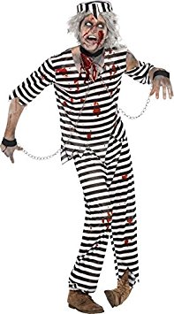 The Zombie Convict costume comes with top, trousers, hat and chain cuffs. The outfit is in the traditional criminal black and white stripes like in the movies complete with bloodstains and rips for the authentic zombie fee.